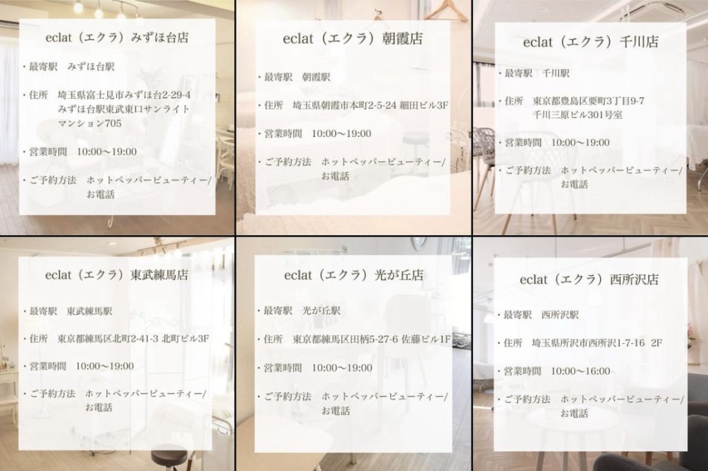 アイラッシュサロン「エクラ」は、東京と埼玉に6店舗を展開し、それぞれの店舗で個性豊かなサービスを提供しています。どの店舗も、まつげエクステやまつげパーマに特化した技術を持ち、初心者からリピーターまで幅広いお客様に対応しています。また、サロンでの施術だけでなく、アフターケアやホームケアについても丁寧にサポートすることで、理想のまつげを長く維持できる環境が整っています。